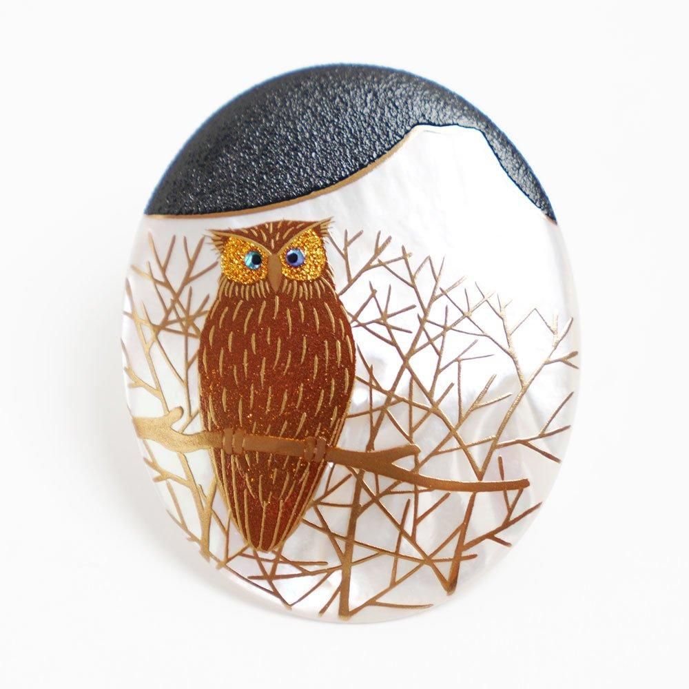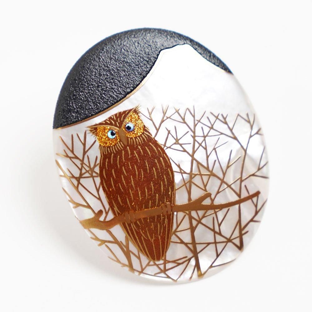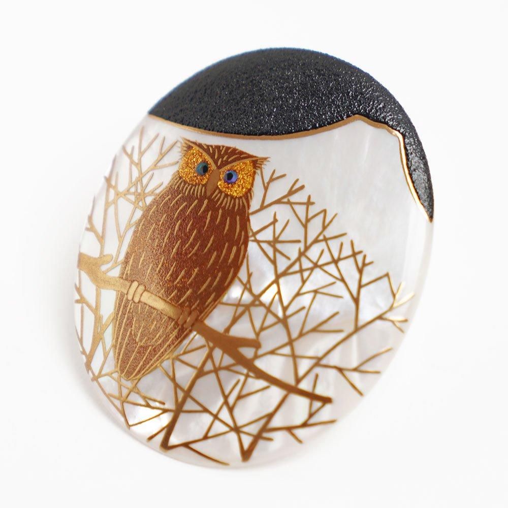 富士山とふくろう蒔絵 白蝶貝ブローチ