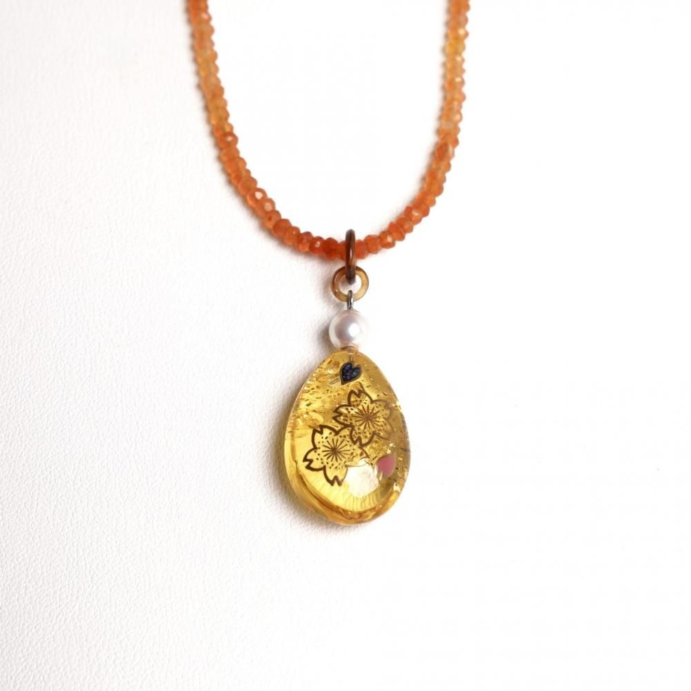 可愛いサイズの琥珀に桜を描いたペンダント。淡水真珠やべっ甲のパーツを組み合わせ、異素材が調和した華やかな作品です。