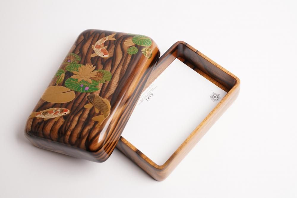 墨を流したような縞杢が特徴の希少材・黒柿(くろがき)を、一木からくり抜いて仕立てた文具箱です。静かな水面に浮かぶ睡蓮と、悠々と泳ぐ錦鯉は高蒔絵で表し、立体感を出しております。吉祥の象徴である錦鯉と、清らかさと再生を寓意する睡蓮を重ねることで、「静謐」と「瑞兆」を同座させた意匠に仕上げました。