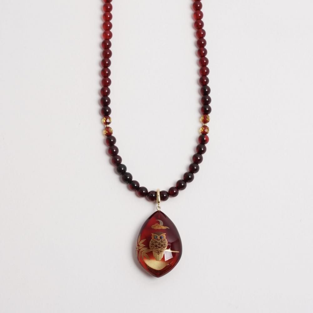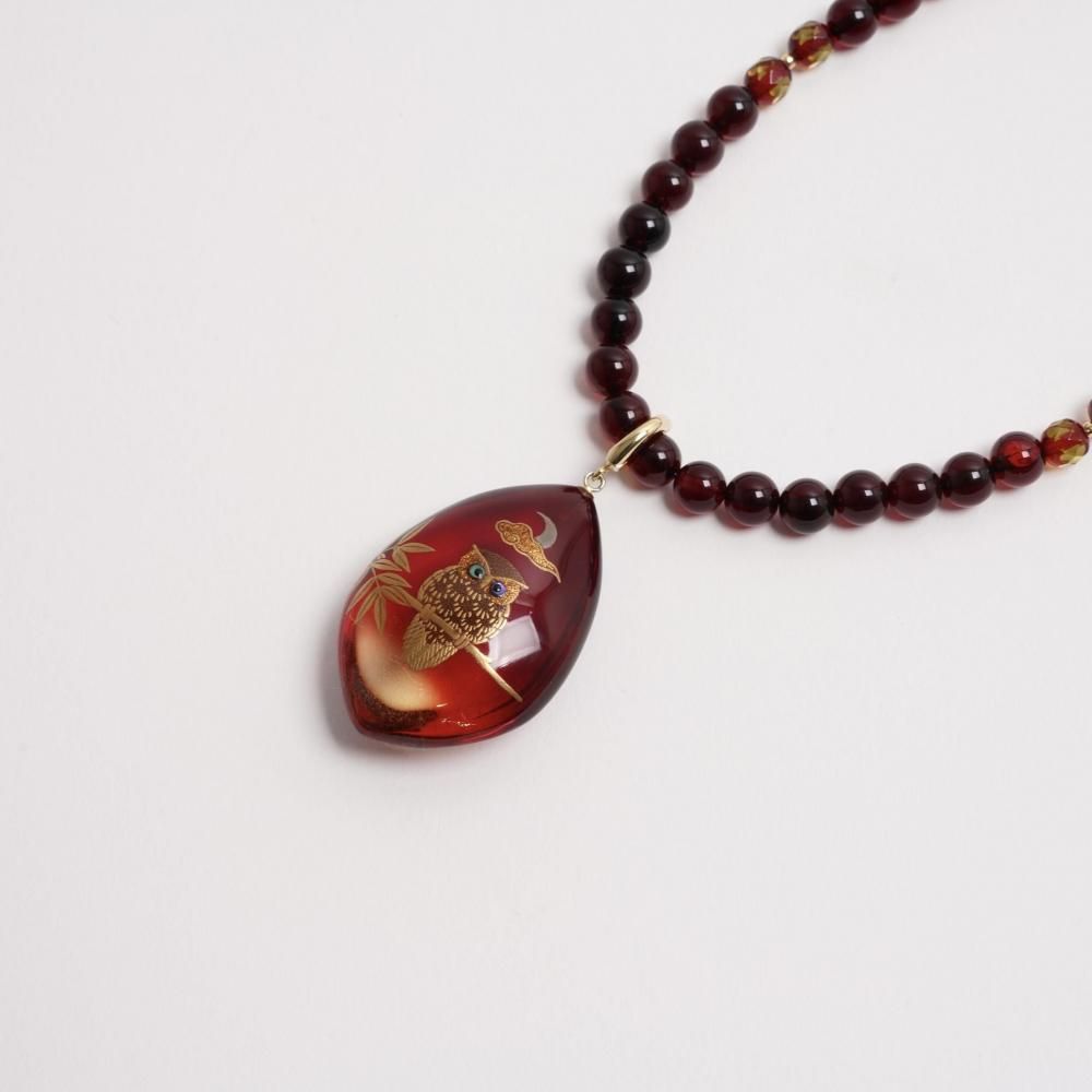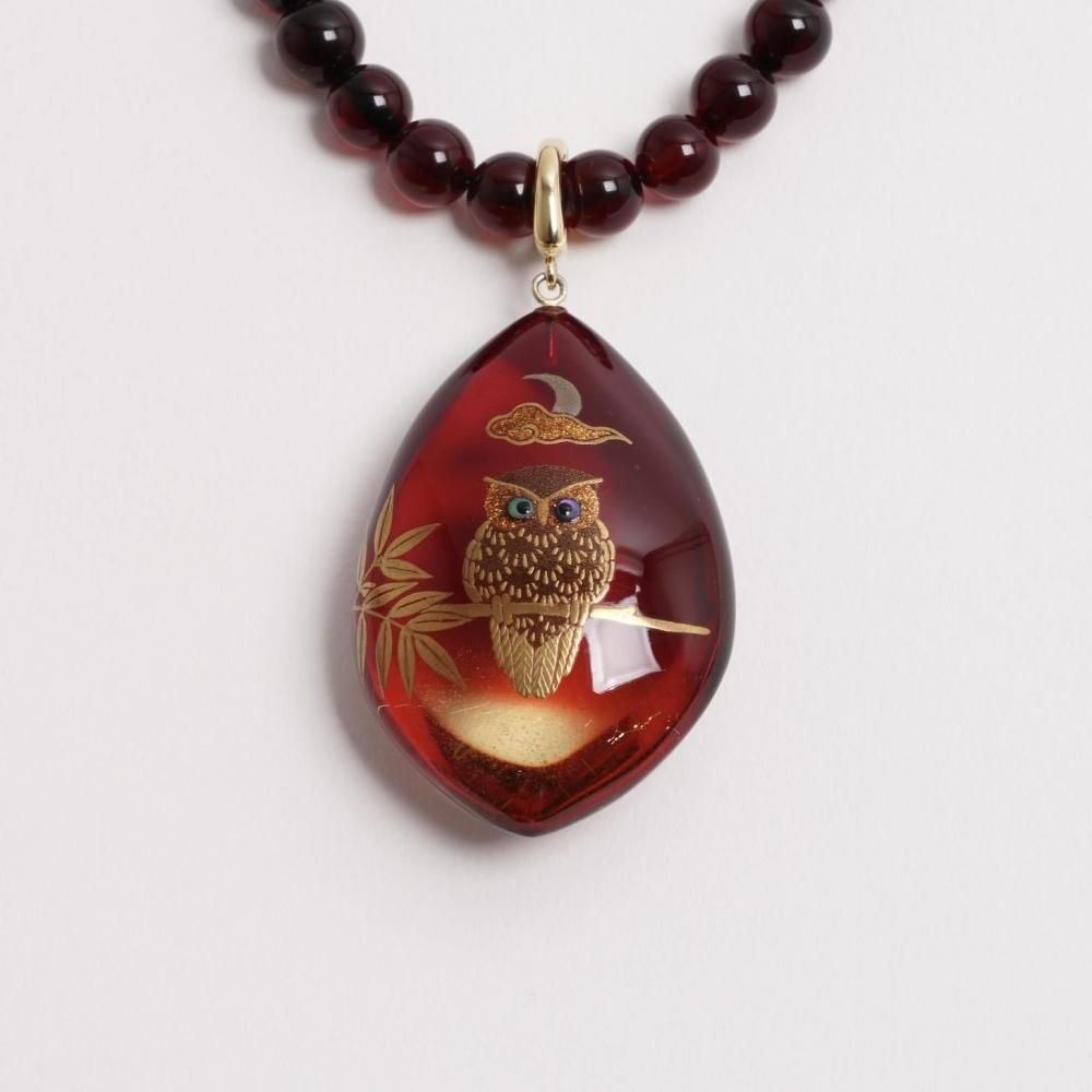 ふくろう蒔絵赤琥珀ペンダント【2025-2026 カタログNo.9掲載品】