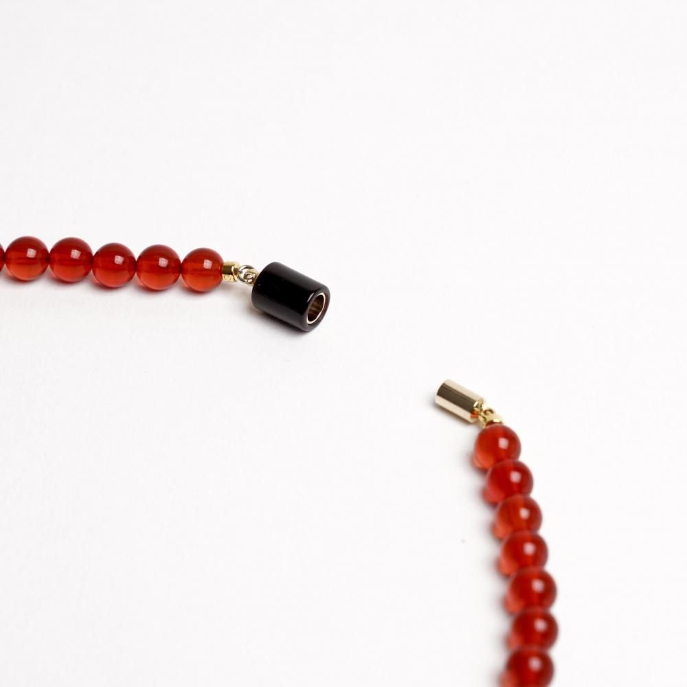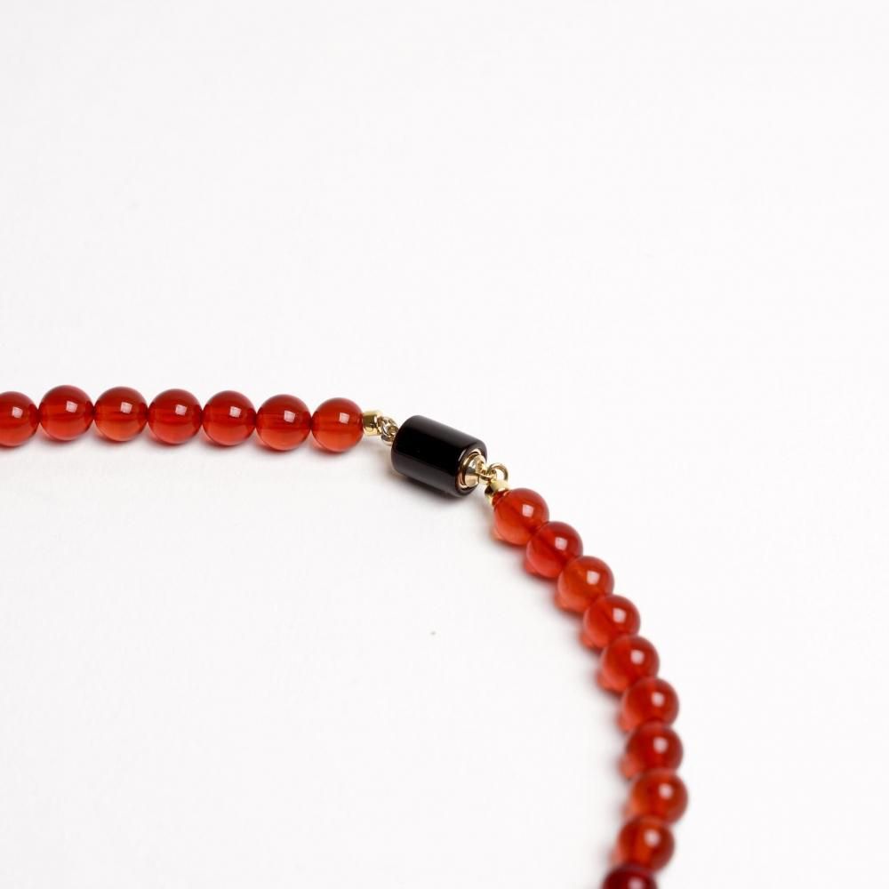 赤琥珀の輝きに梟が映え、装いを格調高く引き立てます。
