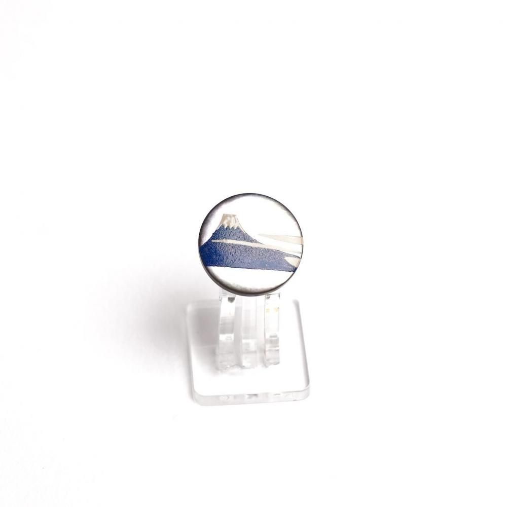 黒蝶貝の上に、山頂に雪を被った青富士を描きました。流れる白雲が景色を引き立てます。