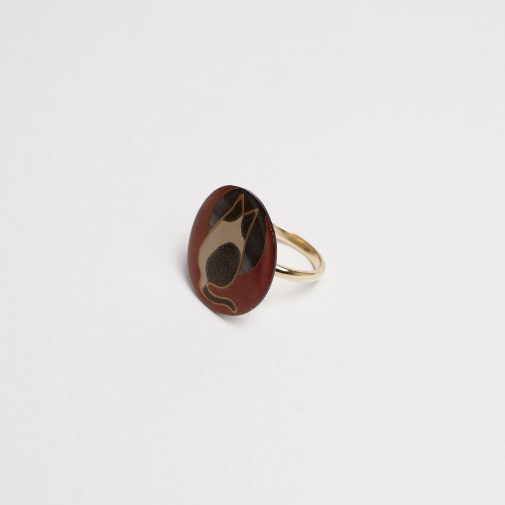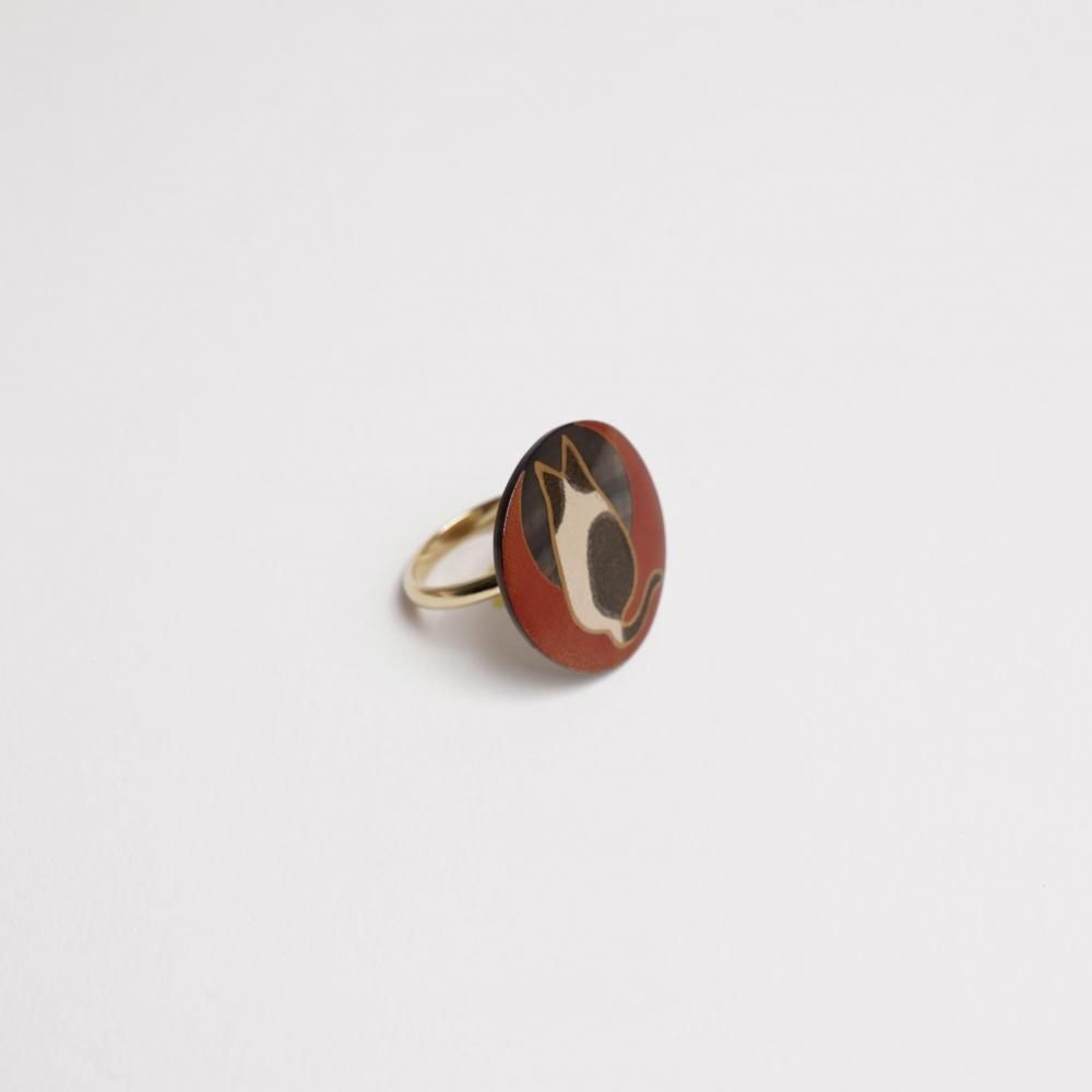 猫の後ろ姿を中央に配し、漆で描いた赤い三日月が幻想的な夜の情景を映した指輪。